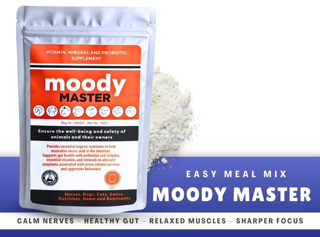 Help your horse stay calm, focused, and balanced with Moody Master – a green apple-flavoured daily supplement rich in essential vitamins, minerals, and probiotics. Powered by Sutherlandia and Fulvic Acid for superior absorption, Moody Master supports gut health, reduces excess intestinal acid, and helps ease stress-related behaviour and nervous tension. A simple addition to daily feed that promotes mental clarity, digestive harmony, and stable temperament – ideal for training, travel, and everyday care.